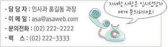 주소 : 서울특별시 가나구 다라동 123번지 아사빌딩 4층 / Tel. 01)234-5678~9 / Fax. 02)234-5610 / E-mail.